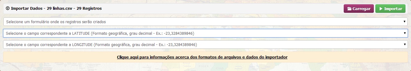 O usuário deve indicar o campo do arquivo carregado que é referente à latitude do registro