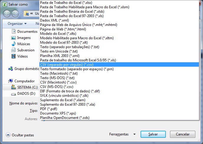 Arquivo » Salvar Como... - No campo Tipo, selecionar formato CSV (separado por vírgulas) (*.csv)