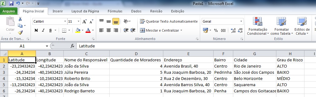 Exemplo de arquivo de dados em forma de tabela no Microsoft Excel para importação