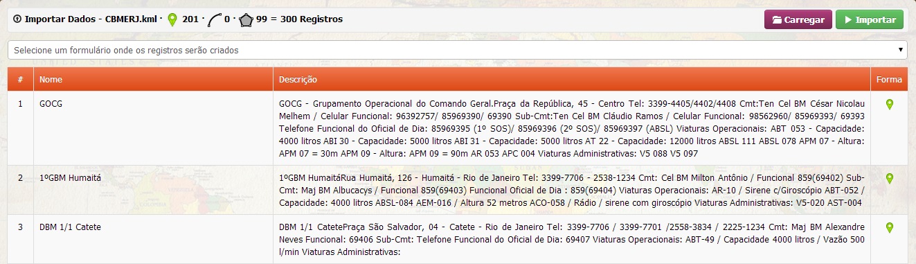 Formulário onde os registros importados (campo 1) serão cadastrados.